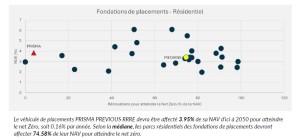 Le véhicule de placements PRISMA PREVIOUS RRRE devra être affecté 3.95% de sa NAV d’ici à 2050 pour atteindre le net Zéro, soit 0.16% par année. Selon la médiane, les parcs résidentiels des fondations de placements devront affecter 74.58% de leur NAV pour atteindre le net zéro.