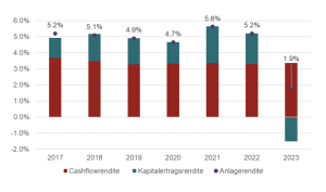 Anlagerendite, Cashflowrendite & Kapitalertragsrendite der kotierten Schweizer Immobilienfonds (2017-2023) (in %)