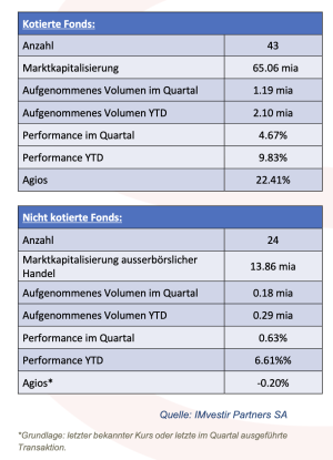 Fonds sowie einige Fonds mit riskanteren Strategien die Anleger an. Bis Ende September erzielten die börsenkotierten und nicht börsenkotierten Fonds eine Performance von 9,83% bzw. 6,61% (1,55%, ohne den Effekt der veränderten Bewertung zum NAV des CS 1A Immo PK), wodurch die Agios auf 22,4% für die börsenkotierten Fonds und -0,2% für die nicht börsenkotierten Fonds zurückgingen. Wir stellen jedoch fest, dass sich die Performanceunterschiede weiter vergrössern und dass es nach wie vor grundlegend ist, mit Vorsicht Produkte auszuwählen, die ihre Ergebnisse nachhaltig sichern und dabei insbesondere die neuen, noch nicht klar definierten Nachhaltigkeitsrichtlinien einhalten können.