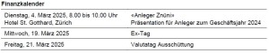 Am 4. März 2025 um 8.00 Uhr präsentiert die Fondsleitung den Jahresabschluss 2024 im Rahmen ei-nes «Anleger Znüni». Die Präsentation findet im Hotel St. Gotthard in Zürich statt. Anmeldungen an ir@immofonds.ch.