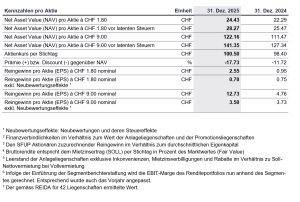 Für das Geschäftsjahr 2026 erwartet das Management, den Reingewinn pro kotierte Namenaktie (exklusiv Neubewertungseffekte) wieder auf das Niveau des Geschäftsjahres 2024 zu erhöhen. Die Gesellschaft ist überzeugt, dass sich ihre kombinierte Investmentstrategie bestehend aus «Fokus auf Lagen» sowie «Realisierung von Stockwerkeigentum» auch in einem von Überregulation und Unsicherheit geprägten Marktumfeld beweisen wird.